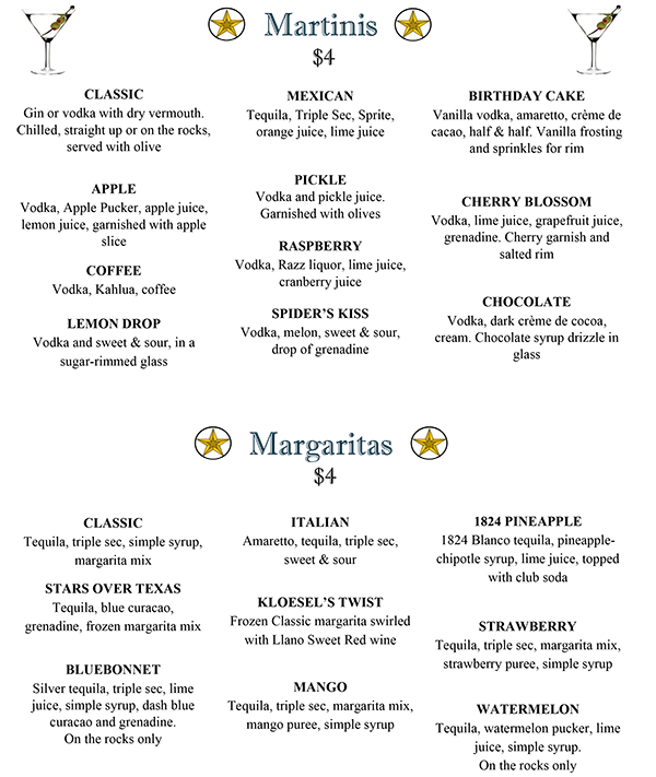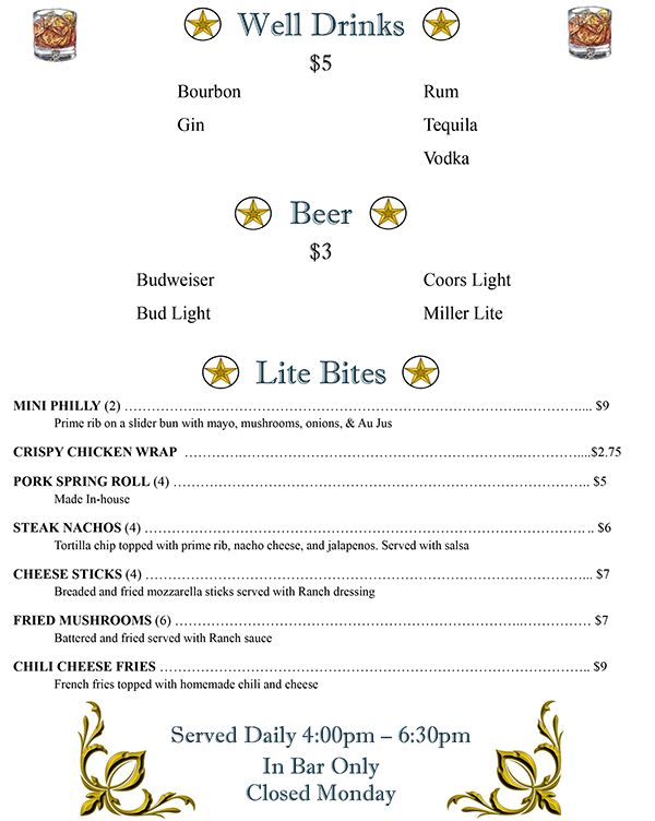 Happy Hour (in bar only) 4 p.m. – 6:30 p.m.
